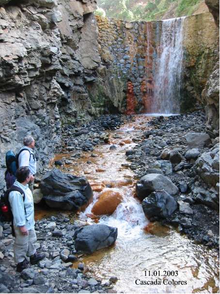 Ab hier folgte man einem Abzweig in den Barranco del Limonero. In dem sehr engen und nur schwer zu passierenden Bachbett erreichte man nach etwa einer halben Stunde die "Cascada Colores", einen farbigen Wasserfall. Das durch Eisenoxide kräftig ockergelb bis rot gefärbte Wasser beeindruckte sehr und bot ein weiteres Fotomotiv. Nach einer kurzen Verweildauer ging es die an eine alpine Klamm erinnernde, enge Schlucht zurück und man suchte sich ein sonniges Plätzchen um die verdiente Mittagspause anzutreten. Danach ging es durch die "Schlucht der Todesängste" mit einigen kurzen Abzweigen da oder dort, zurück zu den wartenden Autos und zum Hotel. Auch auf dieser Heimfahrt wurden, wie immer, die unvergesslich im Gedächtnis eingebrannten, grandiosen Bilder und Eindrücke des Tages ausgetauscht.