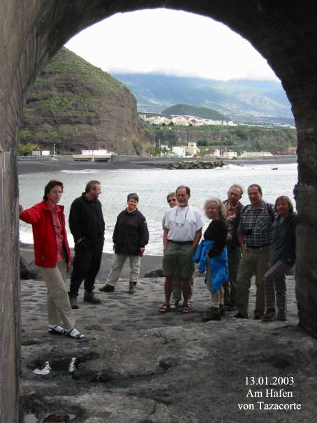 Nach etwa einer Stunde in 1.510m Höhe angekommen hatte man einen grandiosen Blick in die Caldera de Taburiente und den Roque Idafe tief unter sich. Nach einer kurzen Verschnaufpause ging es, immer am Grat entlang, überwiegend bergab. Dabei kam man etwas später sogar an Weinbergen vorbei, in dieser Höhe eher ungewöhnlich. Durch schattigen Kiefernwald, vorbei an Trockensteinmauern voller Hauswurz in allen Größen, erreichte man einige Zeit später den Aussichtspunkt "Torre del Time". Von der Aussichtsplattform hatte man wiederum einen grandiosen Blick tief hinab in den Barranco de las Angustias. Weiter rechts ging der Blick bis hinüber nach El Paso, Los Llanos de Aridane und sogar Puerto de Naos, wo sich das Hotel Sol befindet, konnte man sehen. Nach einer kurzen Mittagspause begab man sich über einen bequemen Fahrweg auf den Rückweg zum Auto. Vorbei an vielen Bananenplantagen machte man noch einen kurzen Abstecher in Puerto de Tazacorte, um sich dann in Richtung Hotel von diesem verträumten Strand zu verabschieden. Für drei Personen aus der Gruppe war dies der letzte Tag und der Rückflug fand am nächsten Tag, dem 14.01.2003, statt.