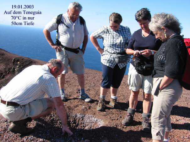 Wanderung auf dem Teneguia, einem Vulkan der erst 1971 ausgebrochen war und wo noch heute aus Erdspalten starker Schwefelgeruch und sehr heiße Luft aufsteigt. Anschließend Besuch des Bauernmarktes in Mazo, im Südosten der Insel. Hier kauften einige der Wanderer die berühmte Mojo rojo (rote Soße, sehr scharf) und andere Spezialitäten der einheimischen Bauern.