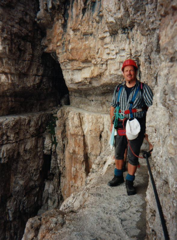zum Vergrößern hier klickenAm dritten und vierten Tag teilte sich die Gruppe. Ein Teil mühte und aktivierte sich weiter rund um den See, ein zweiter Teil (7 Personen) fuhr vom 60km entfernten Madonna di Campiglio mit der Seilbahn hinauf in die hochalpine Brentagruppe, in die wohl aufregendste Kletterregion der Alpen. Auf einer Höhe um 2.500m ging es auf langen, schmalen Pfaden von Hütte zu Hütte über Geröll- und Schneefelder in faszinierender Hochgebirgswelt. Mit Seil und Haken wurden steile Felswände im zentralen Bocchetten-Klettersteig durchstiegen und die Guglia (Felsen wie Finger), das Wahrzeichen der Brenta, war ganz besonders faszinierend. Die spartanische Übernachtung in der Perotti-Hütte war danach für alle eine "Riesengaudi". Über zahlreiche kitzlige Felsen und Leitern ging dieser Zweitagesabstecher erlebnisreich und glücklich zu Ende.