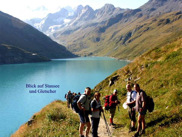 Guter Dinge durch den stressfreien Vortag wurde als erste Unternehmung der Stausee Moiry angefahren und von dort die Hochgebirgshütte Cabane de Moiry (2.825 m) besucht. Von dort bietet sich dem Bergfreund ein eindrucksvoller Blick auf die Gipfel des Grand Cornier und Dent Blanche sowie den Moiry-Gletscher, der in mehreren Stufen zum Stausee fließt. Beim Abstieg teilte sich die Gruppe wobei einige den Gletscher (siehe Bild weiter unten rechts) überquerten und über den Moränenkamm abstiegen während sich der Rest entlang des Gletscherrandes einen abenteuerlichen Abstieg in den Felsen suchte.