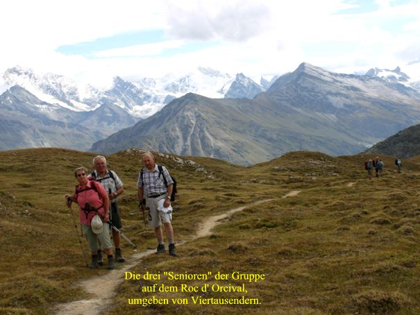 Bei gutem Wetter und sehr angenehmen Temperaturen hatten wir mal wieder das Glück eine der schönsten Wochen im ganzen Jahr zu erwischen. Kleidungsstücke für Kälte und Regen waren nicht erforderlich, wurden aber entsprechend einer berggerechten Ausrüstung natürlich immer mitgeführt. So führte uns der Weg der nächsten Wanderung von der Bergstation Grimentz bis zum Roc d'Orcival hoch, wo aus 2.300 m Höhe ein fantastischer Rundblick möglich war. Das wurde sogar noch übertroffen durch die anschließende Gratwanderung über eine ganze Bergkette hinweg wo jederzeit ein weiter Blick in das Val d'Anniviers und das Rhonetal möglich war. In der Ferne zeigte sogar das Matterhorn seine Präsenz.