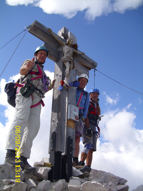 | Bei sog. Kaiserwetter unternahmen wir dann die Umrundung der Drei Zinnen sowie klettern durch den Kriegssteig und über die Gamsscharte bis zur Lavaredohütte inklusive einer hautnah erlebten Bergrettung mit Hubschrauber an senkrechter Felswand. Gott sei Dank nur eine Übung der Bergwacht. Weitere Wege führten uns vom Fischleintal über die Rotwandwiesen zum Kreuzbergpass und von Alpe Nemes über die Klammbachalm. Als persönlichen Höhepunkt der Woche nutzten 4 Personen der Gruppe den Aufstieg zur 2965m hohen Sextener Rotwandspitze. Steile Wände und Kletterpassagen mussten auf 1000 Höhenmeter überwunden werden bis das Ziel erreicht war. Kurios waren dann die Platzverhältnisse am Gipfel wo für das Beweisfoto immer nur 3 Personen am Kreuz posieren konnten. |