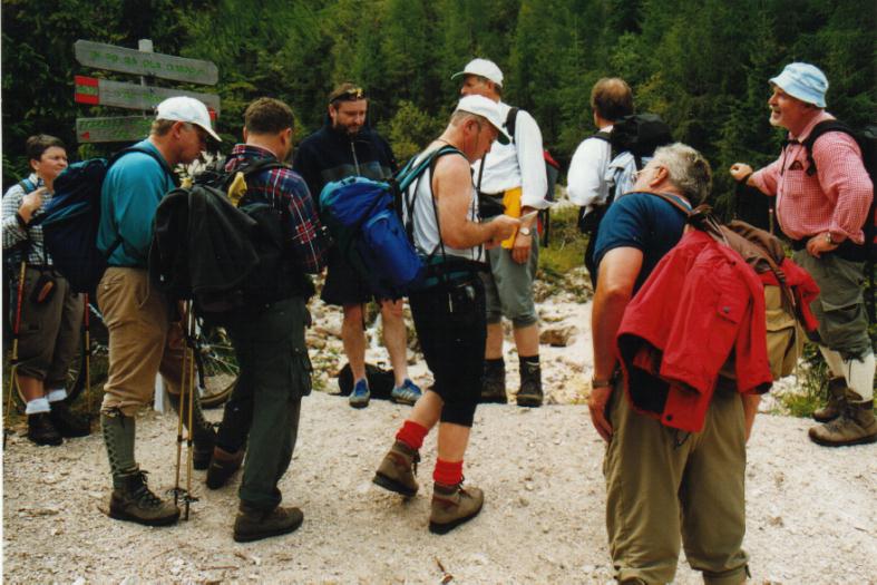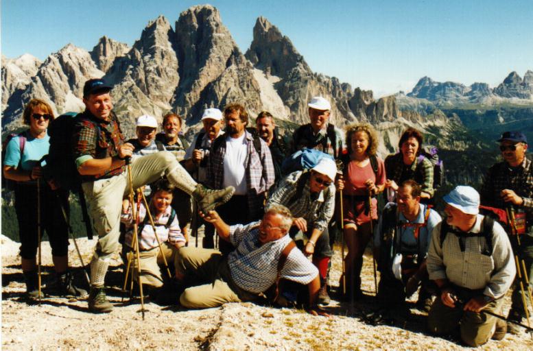 Ein weiteres Wandererlebnis bescherte die Tour zum Monte Nuvolau (2.575m), mit herrlichem Ausblick in die umliegenden Täler. Beim Abstieg konnten einige Bergsteiger-Profis beobachtet werden, die an den senkrechten Felswänden der weltbekannten Cinque Torri (fünf Finger) ihre Fähigkeiten prüften. Mit Seil, Hammer und Haken an solch steilen Wänden ist jedoch nicht die Stärke der Mitglieder der Wandergruppe. So waren alle froh, mit der Gondelbahn die ersten 500 Höhenmeter zum Tondi de Falcora überwinden zu können. Es folgte eine herrliche Route über den Nordhang des Faloria bis zum Pass Tre-Croci (Drei Kreuze) am Rand von Cortina. Ausgestattet mit schönen Klettereinlagen, schmalen Trampelpfaden und seilgesicherten Passagen inklusive einem herrlichen Abstieg zum Lago Sorapsis konnte auch diese Tour die Wanderer zufrieden stellen.