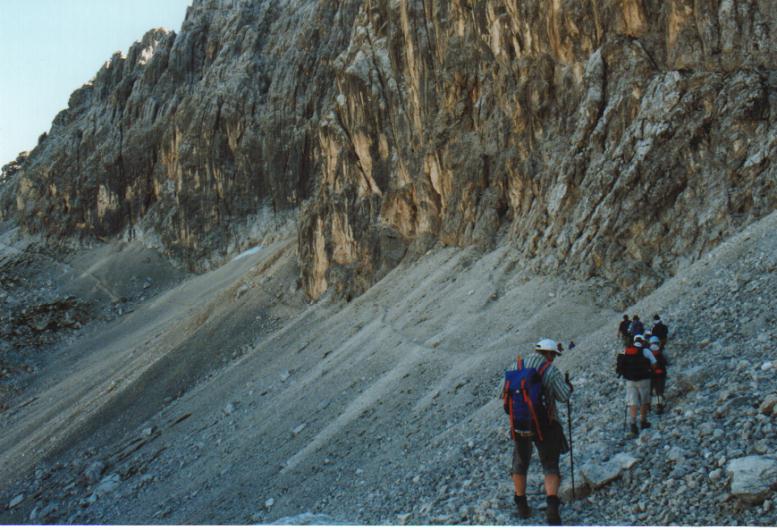 Geteilt in zwei Gruppen starteten die Wanderer am 3. Tag zu unterschiedlichen Zielen. Gruppe 1 machte ausgehend von der Bergstation Falzarego die sog. Selares Runde um den kleinen Lagazuoi. Eine Bergwelt mit Landschaftsbildern von erlesener Schönheit und imponierendem Ausblick zu den Dolomiten des Gadertales. Die 2. Gruppe fuhr von Cortina mit der Seilbahn zum Forcella Staunies, etwa 100 m unter dem Gipfel des Monte Cristallo, dem Wahrzeichen der gesamten Gegend bzw. dem Hausberg von Cortina d'Ampezzo. Über mehrere Leitern und einen vereisten Holzsteg starteten die Männer in den berühmten Dibona-Weg und erreichten bald den Ponte Cristallo. Eine 27m lange Hängebrücke, die in ca. 2.900m Höhe eine mehrere hundert Meter tiefe Schlucht zwischen den Felstürmen des Cristallo überwindet. Falls irgendwo Angstgefühle da waren, so wurden sie unterdrückt und der Übergang beschritten. Ein kurzer Besuch galt dem Gipfel Cristallino d'Ampezzo (3.008m), der über einen steilen Grat zu erreichen war. Ein besonderer Platz für Erinnerungsfoto und eindrucksvolle Filmszenen bevor der Abstieg zur Forcella Grande, einer alten Kriegsstellung in 2.874m Höhe, begann. Danach folgte ein nicht enden wollender Höhenweg auf ca. 2.700m über mehrere Stunden bis riesige Geröllfelder den Weg ins Tal einleiteten.
