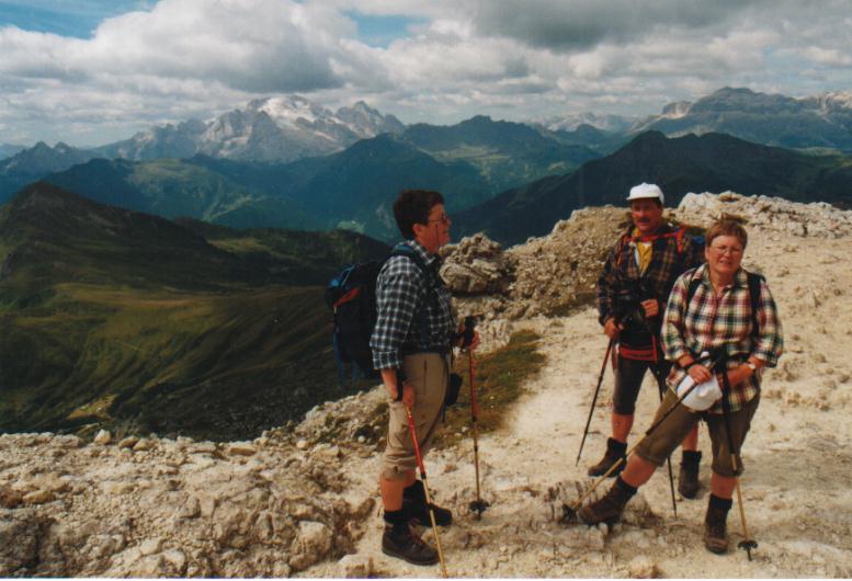 Und wieder wählten die Männer und Frauen aus Spiesheim, Ensheim und Wörrstadt ein Wanderziel in der Südtiroler Alpenregion. Einige reisten direkt aus dem Alltag der Heimat an, wogegen der Rest aus einem anderen Urlaubsdomizil kam, um den Urlaub mit einer zünftigen Wanderung zu beenden. Ausgehend vom Quartier in Pocol, hoch über Cortina d'Ampezzo, führte die erste Wanderung über die Hänge des Col (Hügel) Rosa zu den Wasserfällen im Fanes Tal. Für einige das erste Mal im Leben, mitten durch einen Wasserfall zu gehen, ohne nass zu werden. Ein Erlebnis, das mit ganz persönlichen Eindrücken am Abend diskutiert wurde.