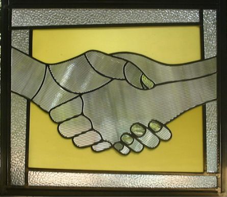 Das Symbol der sich umfassenden Hände an prominenter Stelle ist mein ganz persönlicher Beitrag zu der Gesamtverglasung. Es erinnert an die Widmung des Gebäudes für gemeinschaftliche Veranstaltungen und besonders an die schon erwähnte Aufbauleistung der Spiesheimer Bevölkerung bei der Renovierung der Sängerhalle.