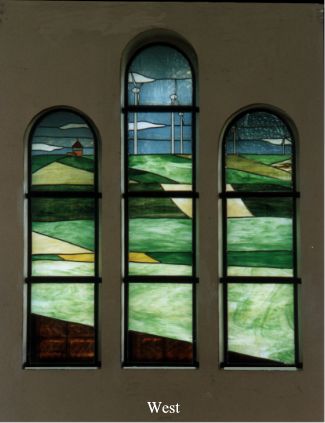 Es lag nun nahe - immer auf der Suche nach den für eine Gestaltung geeigneten Fenstern -, auch die gegenüberliegende Fenstergruppe ins Auge zu fassen. Die altarartige Gruppe von 3 hochformatigen Rundbogenfenstern ergibt auch zusammengenommen ein Hochformat, sodass sich mir in sinnvoller Ergänzung zum horizontal betonten Ostfenster die Erstellung eines vertikalen Landschaftsprospekts anbot. Hierbei kamen mir die schlanken, hoch aufragenden Windkrafträder mit ihrer ästhetisch reizvollen Form entgegen. Sie haben sich in Verbindung mit dem - ebenfalls neuen - Weinbergsturm in kürzester Zeit als weithin sichtbares Wahrzeichen der Gemeinde etabliert und sind für mich ein positives Symbol für eine bessere Zukunft, einen verantwortungsvollen Umgang mit Ressourcen.