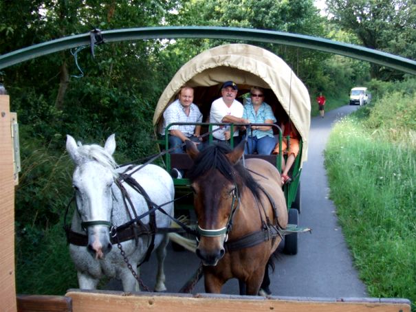 Um 8:00 Uhr war es so weit. Wir trafen uns am Feuerwehrgerätehaus, beluden Bus und Begleitfahrzeug und starteten zu unserer Planwagentour in den Hunsrück. Unser Ziel war der Reiterhof St. Georg in Herrstein. Dort angekommen, mussten die Pferde von der Koppel geholt und im Stall noch einmal geputzt und ausgehfein hergerichtet werden. Eines unserer Pferde, der Obelix, benötigte ein neues Eisen. Zwischenzeitlich hatte sich auch gezeigt, wer einen "guten Draht" zu größeren Tieren hat und damit die Zügel und Bremse in der Hand hält. Die anderen beluden die Planwagen. Dann wurden wir in das Einspannen eingewiesen und es ging los.
