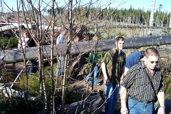 Die Heimreise führte uns entlang der Schwarzwaldhochstraße zum Schliffkopf und wir besuchten den "Lotharpfad". Mit Windgeschwindigkeiten über 200 Stundenkilometer fegte der Orkan ,Lothar' am 2. Weihnachtsfeiertag 1999 über Baden-Württemberg hinweg und hinterließ in den Wäldern 30 Millionen m³ Sturmholz und 40.000 ha Kahlfläche. Entlang eines 800m langen Erlebnispfades auf einer 10 ha großen Sturmwurffläche konnten wir beobachten, wie nach und nach die Sturmfläche wieder neu besiedelt wird. Der "Lotharpfad" führt über Stege, Leitern und Treppen und bietet Einblicke, wie Naturkräfte wirken, wie die Natur mit einer solchen Fläche umgeht und was von selbst wieder entsteht.