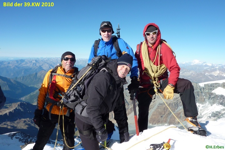 Nach verzögertem Beginn gelingt es der Seilschaft mit Heribert Erbes durch verbesserte Witterungsbedingungen und guter Routenführung in zwei Tagen insgesamt sechs Viertausender zu besteigen. Im einzelnen sind dies: das Balmenhorn (4.215 m), der Castor (4.221 m), die Eisnase (4.244 m), die Ludwigshöhe (4.341 m), das Schwarzhorn (4,322 m), und Die Vincent- Pyramide (4.217 m). Des öfteren gilt es dabei Eisschrauben zu setzen, und Fixseile zu legen, um sich mit diesen Hilfsmitteln, in Verbindung mit dem aktiven Einsatz von Steigeisen und Eispickel durch vereiste Wände und Übergänge zu arbeiten. Am Balmenhorn muss beispielsweise eine ca. 60 m hohe nahezu senkrechte Wand überwunden werden, um ganz nach oben zu gelangen. Der Rundumblick von der Ludwigshöhe bei allerbester Fernsicht zeigt unter anderem das legendäre Matterhorn ganz in der Nähe, als relativ kleine Spitze auf Augenhöhe, den Grand Paradiso im Süden, das Mont- Blanc- Massiv im Westen, das Berner Oberland im Norden und die ferne Ortler- Gruppe im Osten. Auf der Vincent- Pyramide stürmt es so heftig, dass es die Gruppe nur sehr kurz auf dem Gipfel aushalten kann.