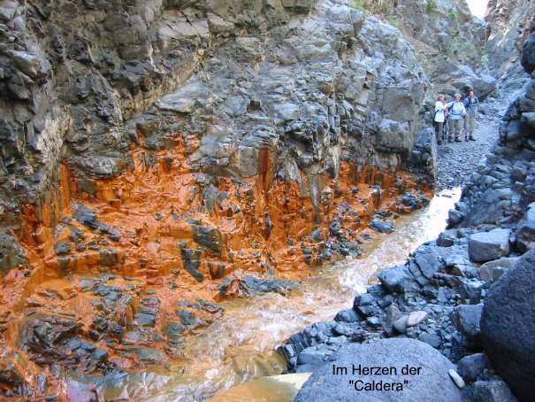 PKW auf abenteuerlichen Wegen bis zum "Barranco de las Angustias". Ab hier folgte man, jetzt zu Fuß, immer dem wildromantischen Geröllbett talaufwärts. Dabei musste der mal breite, mal schmale Bach immer wieder auf wackligen Steinen überquert werden, weil steile Felsen auf der einen oder anderen Seite den Weg versperrten. Besonders schwierig gestaltete sich die Überwindung des Rio de Taburiente, der beim Wasserwerk "Dos Aguas" in den Barranco Almendro Amargo mündet. Als dieses Hindernis nach einigem Gelächter, wegen teils nasser Füße, überwunden war, hatte man einen sehr schönen Blick auf den Roque de Idafe. Er wurde vom altkanarischen Stamm der Aceró, der die Caldera bewohnte, als heilig verehrt.