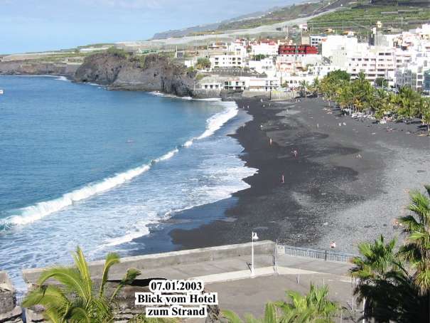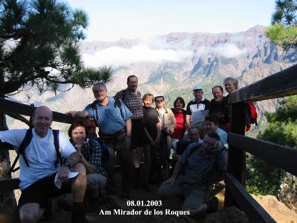 Nach etwa einer Stunde in 1.510m Höhe angekommen hatte man einen grandiosen Blick in die Caldera de Taburiente und den Roque Idafe tief unter sich. Nach einer kurzen Verschnaufpause ging es, immer am Grat entlang, überwiegend bergab. Dabei kam man etwas später sogar an Weinbergen vorbei, in dieser Höhe eher ungewöhnlich. Durch schattigen Kiefernwald, vorbei an Trockensteinmauern voller Hauswurz in allen Größen, erreichte man einige Zeit später den Aussichtspunkt "Torre del Time". Von der Aussichtsplattform hatte man wiederum einen grandiosen Blick tief hinab in den Barranco de las Angustias. Weiter rechts ging der Blick bis hinüber nach El Paso, Los Llanos de Aridane und sogar Puerto de Naos, wo sich das Hotel Sol befindet, konnte man sehen. Nach einer kurzen Mittagspause begab man sich über einen bequemen Fahrweg auf den Rückweg zum Auto. Vorbei an vielen Bananenplantagen machte man noch einen kurzen Abstecher in Puerto de Tazacorte, um sich dann in Richtung Hotel von diesem verträumten Strand zu verabschieden. Für drei Personen aus der Gruppe war dies der letzte Tag und der Rückflug fand am nächsten Tag, dem 14.01.2003, statt.